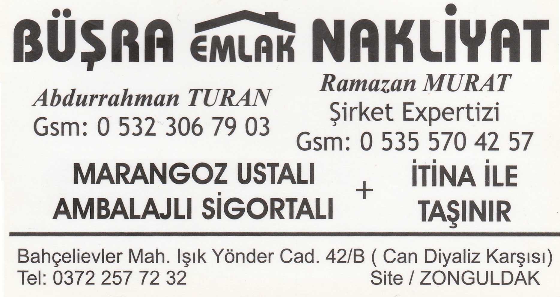 Firmamız Zonguldak Büşra Nakliyat Adı Altında 15 Senedir Siz Zonguldak Halkına Ve Şehir Dışından Gelen Vatandaşlarımıza Kaliteli Güvenilir Hizmet Anlayışı İle Evden Eve Nakliyat Asansörlü Nakliyat Şehir İçi Nakliyat Şehirler Arası Nakliyat Ve Emlak Hizmeti Sunmaktayız